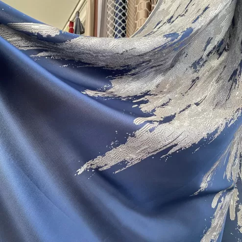 Această draperie este realizată dintr-o țesătură de calitate superioară cu un finisaj satinat în nuanță intensă de albastru închis. Modelul decorativ este aplicat printr-un efect de broderie cu fire lucioase în tonuri de argintiu și gri deschis asemănător unor urme largi de pensulă sau forme organice. Designul modern adaugă textură vizuală și un aspect dinamic. Materialul de calitate este potrivit atât pentru decor cât și pentru filtrarea luminii.