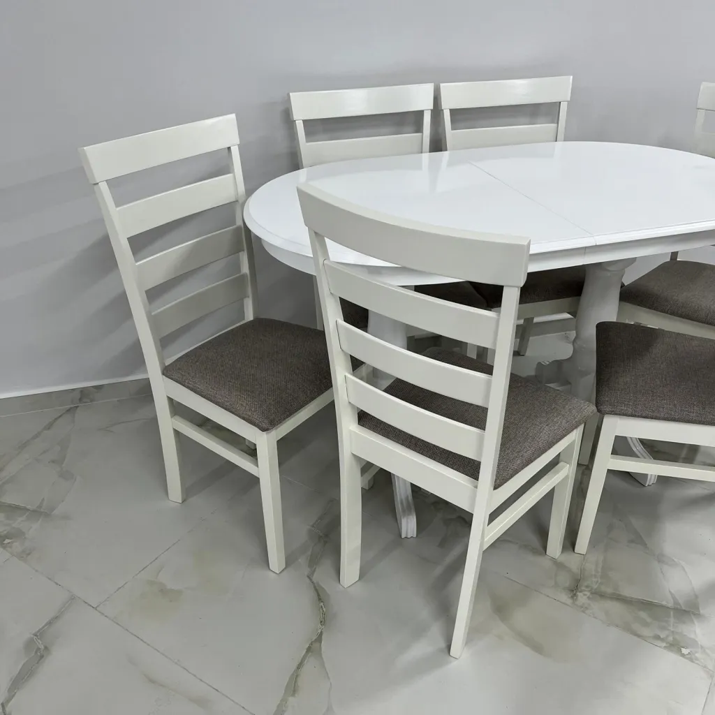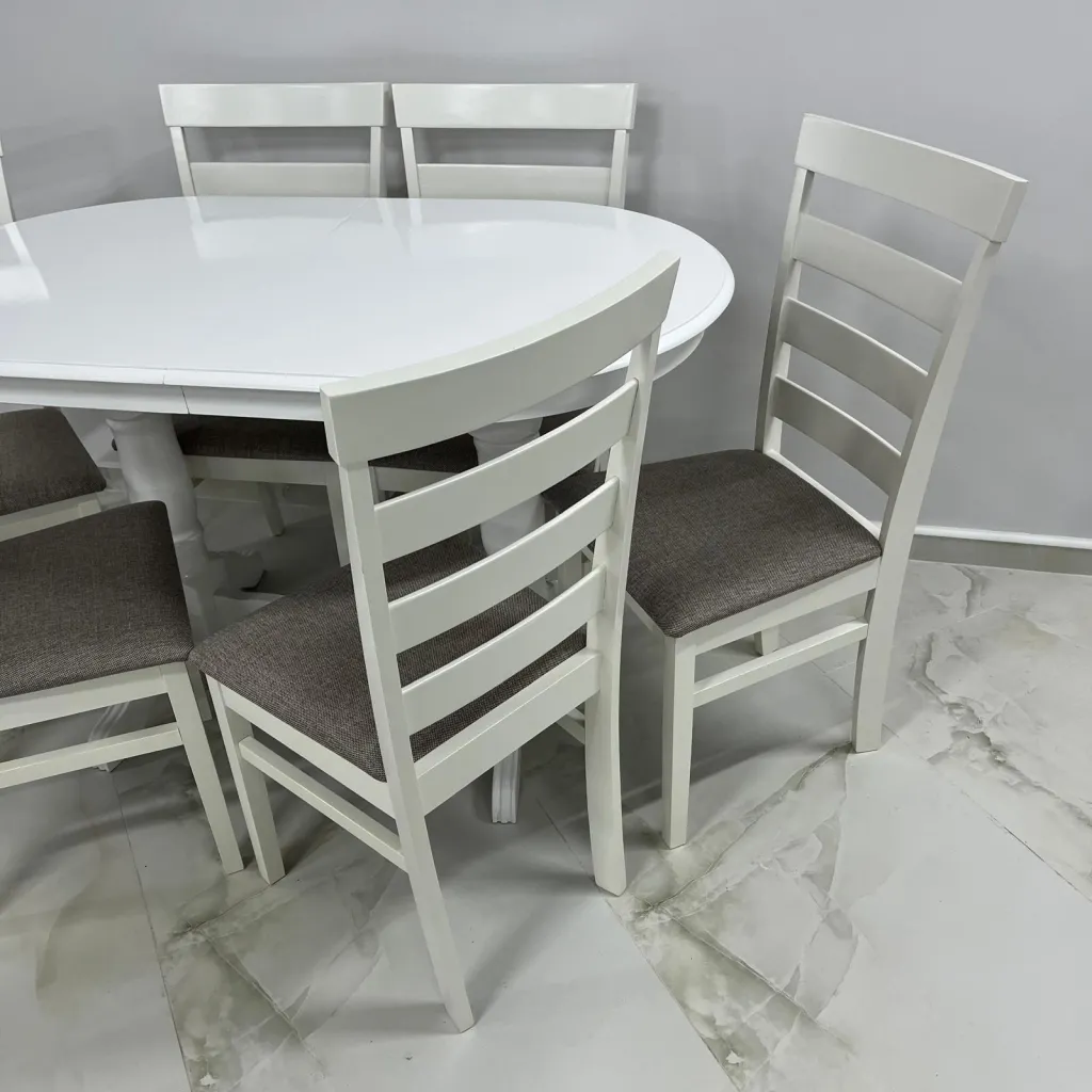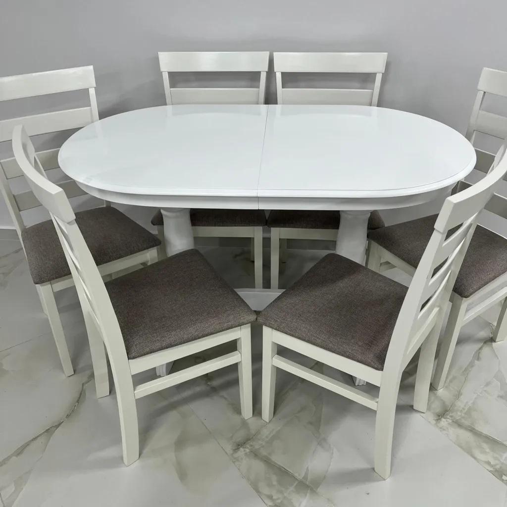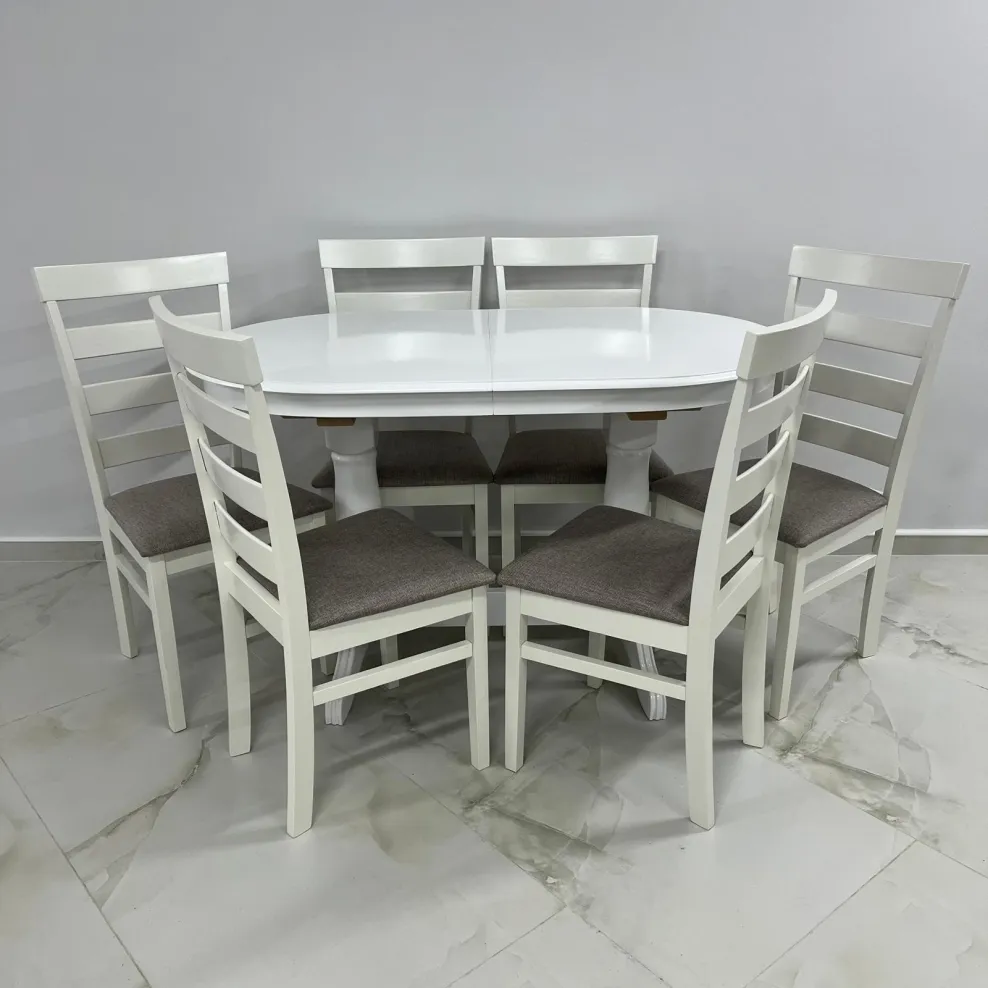 Дополните обеденную зону комплектом мебели, состоящим из овального раздвижного стола и 6 стульев чистого белого цвета. Светлый тон подчеркивает визуальную чистоту помещения и создает впечатление порядка и свежести. Столешница быстро раскладывается, что делает его идеальным для семейных ужинов или особых мероприятий. Сидение обеспечивает равновесие благодаря широкой спинке со ступенчатой конструкцией, а мягкое сиденье - дополнительный комфорт. Изготовленный из натуральной древесины твердых пород, этот комплект долговечен и легко вписывается как в современные, так и в классические интерьеры. Это отличный вариант для тех, кто ценит функциональность в сочетании с классическим дизайном.