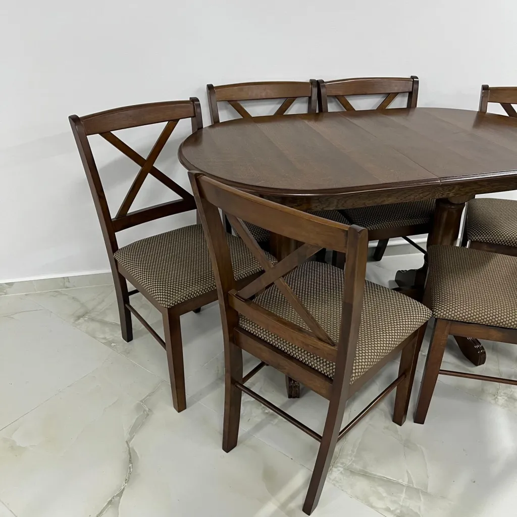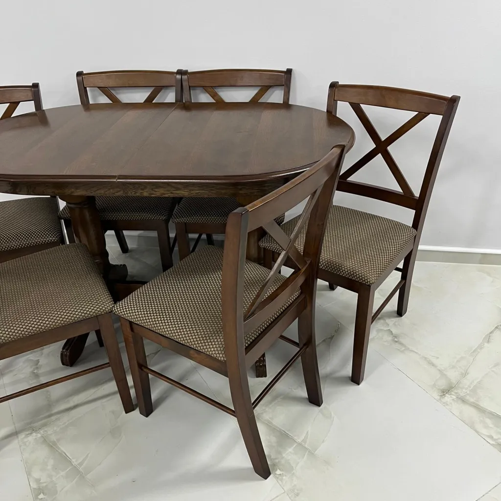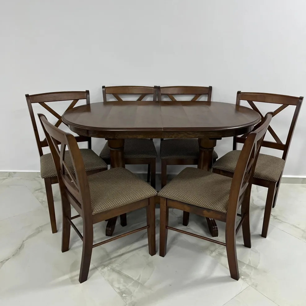 Откройте для себя универсальность этого набора состоящего из овального стола и шести стульев, разработанного специально для больших семей или тех кто часто принимает гостей. Столешница овальной формы легко раскладывается что делает ее идеальной для различных повседневных сценариев, от быстрых завтраков до семейных ужинов или особых мероприятий. Эргономичные стулья с крестообразными спинками обеспечивают дополнительную поддержку и комфорт благодаря мягкой обивке. Изготовленный из твердых пород дерева, весь ансамбль гарантирует прочность и долговечность. Эта модель прекрасно впишется в обеденные зоны, современные кухни или интерьеры с открытой планировкой.