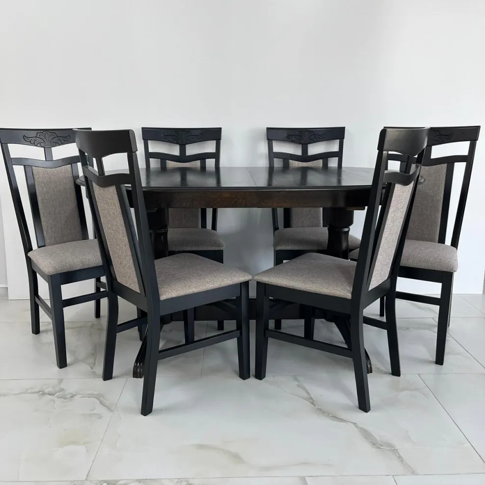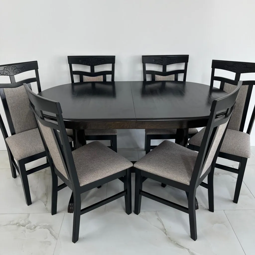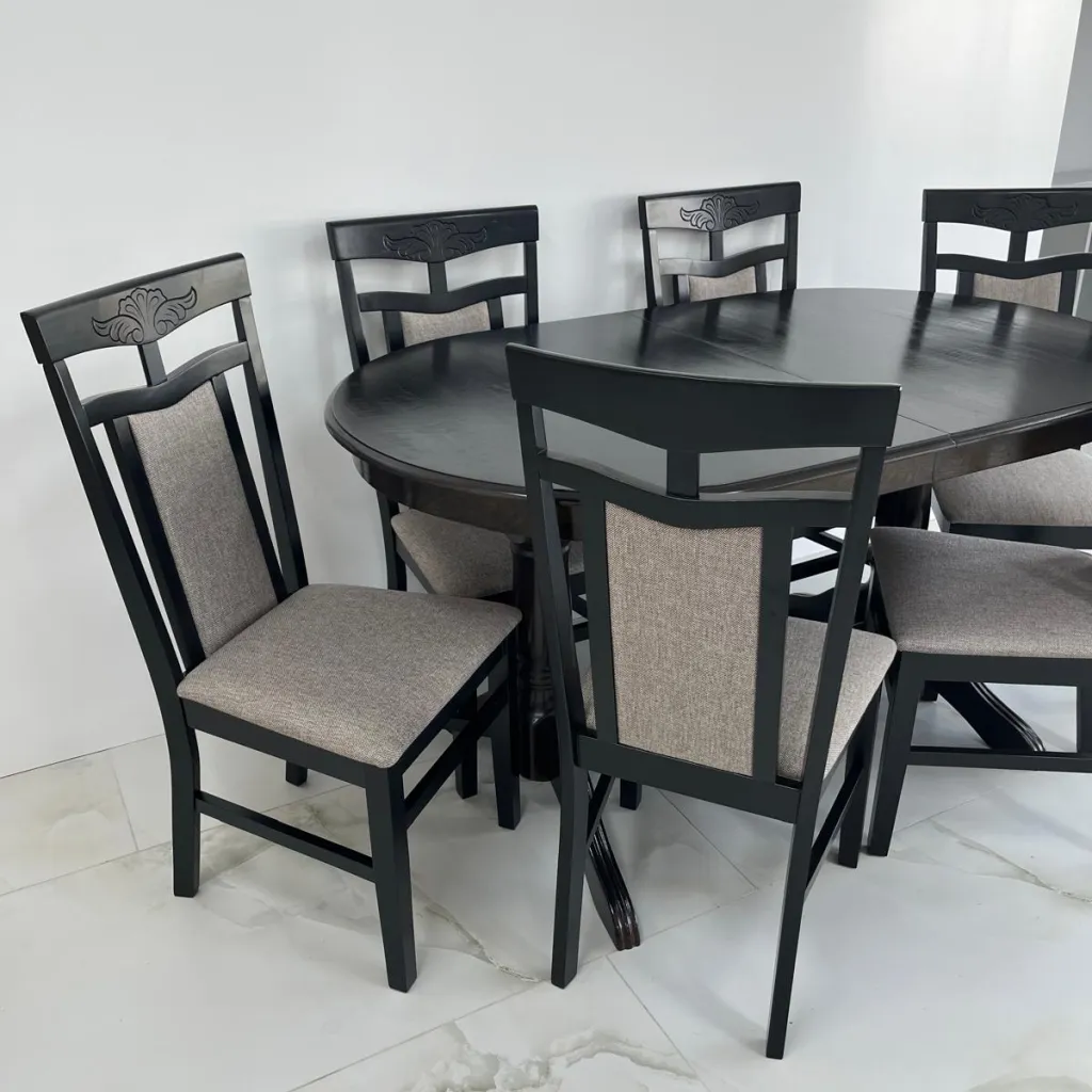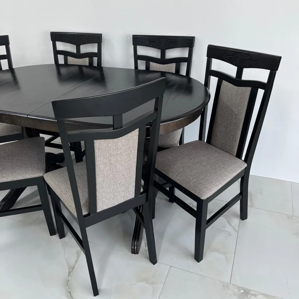 Если вы хотите создать стильный и в то же время уютный обеденный уголок то этот овальный обеденный стол - именно то что вы ищете. Стол имеет классический дизайн с прочным каркасом из массивного дерева, окрашенным в черный цвет который легко дополнит любой стиль декора. Благодаря возможности удлинения он достаточно просторен чтобы разместить всю семью. Стулья хорошо выполнены с высокими спинками. Обивка в бежевых тонах добавляет приятный контраст, легка в уходе и практична. Идеальный вариант если вы хотите чтобы в вашем помещении чувствовался домашний уют.